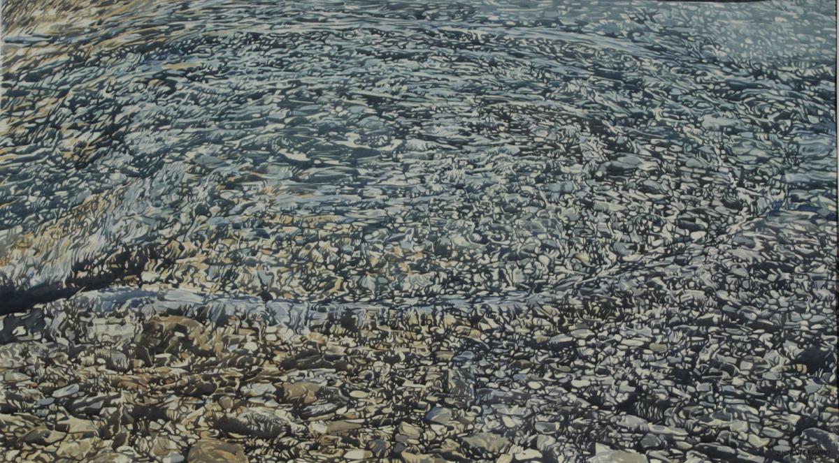 L’opera cattura l’istante in cui un movimento lieve increspa la superficie dell’acqua, creando cerchi che si espandono lentamente. Le pietre sottostanti rimangono visibili, ma si trasformano in ritmo e vibrazione. Ciò che è solido e ciò che è fluido convivono in un’unica percezione, dove la luce diventa tempo che scorre.